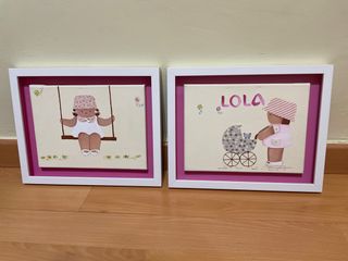 Conjunto de dos cuadros infantiles, ideales para decorar una habitación. - Pintura original sobre lienzo. - Marco blanco con paspartú rosa. - Diseño de niña en un columpio. - Diseño de niña con carrito y nombre 'LOLA'.