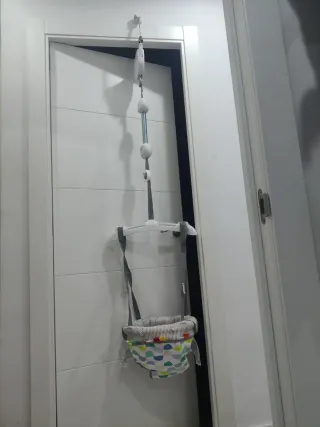Columpio para bebé diseñado para marcos de puerta. Es fácil de instalar y desmontar. - Estructura de metal y plástico. - Asiento acolchado. - Altura ajustable.