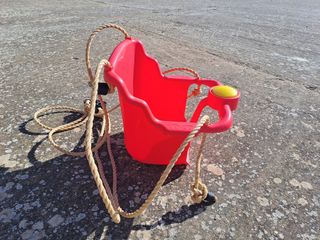 Columpio para bebés y niñ@s de hasta 5 años. Ideal para el entretenimiento y el desarrollo. - Estructura de madera. - Asiento de tela roja acolchada. - Cuerdas resistentes para colgar.
