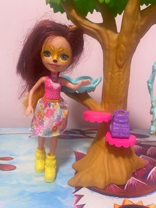 Casa del árbol de Enchantimals con varios accesorios. - Incluye columpio con figuras de pandas. - Mesa con sillas y pastel. - Cama y cuna. - Mueble de cocina morado.
