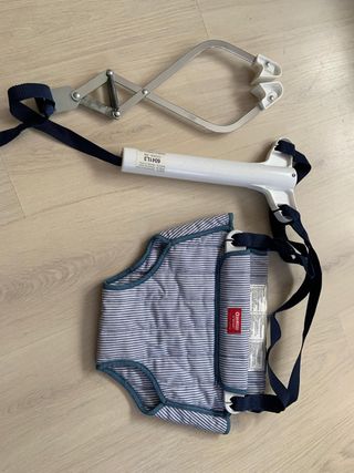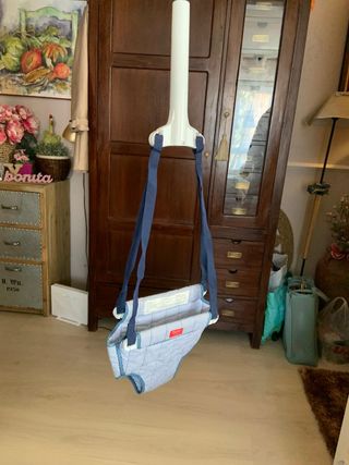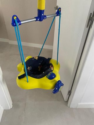 Se vende columpio saltador para bebé, en buen estado. - Ideal para que el bebé se divierta. - Incluye dos correas de sujeción azules. - Estructura de plástico blanco y asiento amarillo.