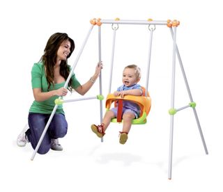 Este columpio está especialmente diseñado para bebés de 0 a 36 meses. Columpio infantil de 120 cm. de alto. Estructura de tubo de acero de fácil ensamblado y alta resistencia. Asiento evolutivo de plástico rígido y seguro, anillo de seguridad separable. Protectores en la terminación de todos los tubos. Se puede utilizar tanto en interior como en exterior. Dimensiones: 1.20 x 1.24 x 1.20 m (largo, ancho, alto).