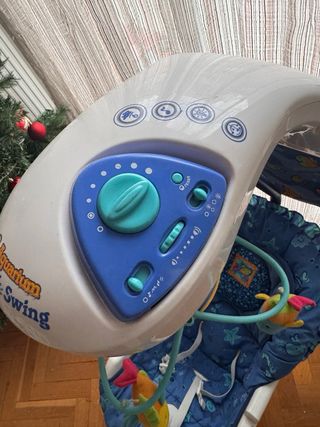Columpio musical de Fisher Price con temática acuática. - Diseño con peces y estrellas de mar. - Incluye peluches colgantes. - Arnés de seguridad.