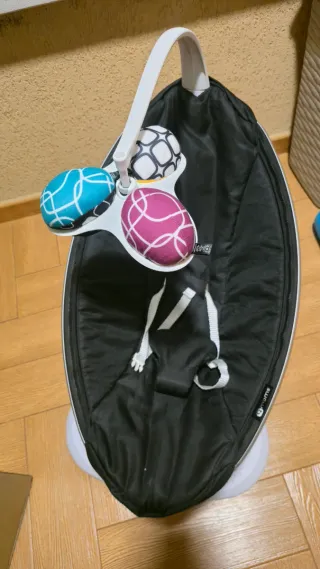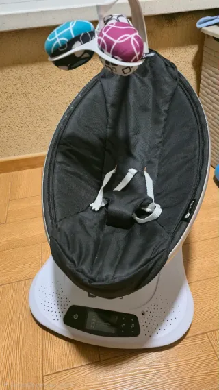 La 4moms mamaRoo 4 es una hamaca de alta tecnología para bebés que imita los movimientos naturales de los padres (coche, canguro, columpio en el árbol, mecer, olas) con 5 velocidades, sonidos integrados, conexión MP3 y control por Bluetooth, ideal para calmar y entretener al bebé desde el nacimiento hasta los 9 kg, y funciona enchufada a la corriente. En perfecto estado, como nueva, muy poco uso, con caja