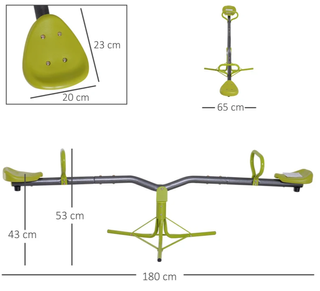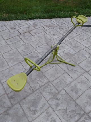Balancín de metal y plástico para niños. - Asientos de plástico verde. - Estructura de metal gris. - Medidas: 180 cm de largo, 65 cm de ancho, 43 cm de alto del asiento. - Dimensiones del asiento: 20 cm x 23 cm.