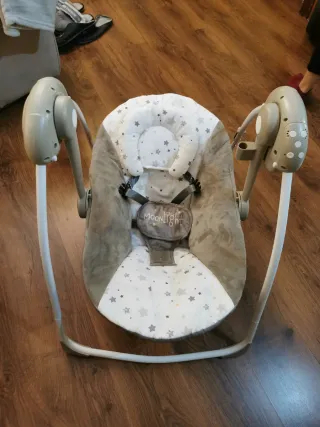 Vendo columpio para bebé en buen estado. Es de color beige claro con lunares grises. - Incluye bandeja. - Mecanismo de balanceo. - Se encuentra en perfectas condiciones.
