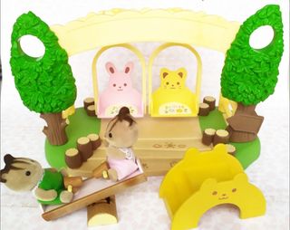 Casita en el árbol, en perfectas condiciones,con escaleras, tobogán y un cesto con peso para poder subir cosas , salvo el columpio q en la esquina inferior le falta un poco, se ve en una foto, dos muñecos conejo y un baño completo y una mesa y dos sillas