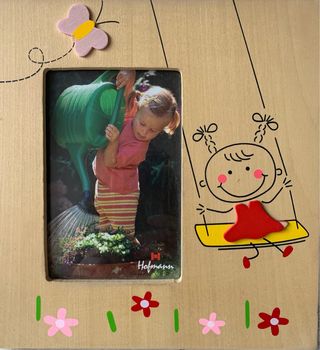 Marco de fotos de madera con un diseño infantil. - Decorado con una mariposa y una niña columpiándose. - Incluye una foto de una niña regando plantas. - Detalle de flores pintadas en la base.