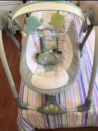Columpio para bebé que se convierte en hamaca extraible. Contiene distintos modalides de sonido y vibración. Puede tener alguna marca del uso, ya que se ha usado de forma puntual hasta los 9 meses del bebé. DESCRIPCIÓN DEL PRODUCTO: • Edad: desde 0 meses • Dos productos imprescindibles para los padres en uno Design • El asiento blando del columpio se puede quitar y convertir en una hamaca en un abrir y cerrar de ojos • Tanto el columpio como la hamaca ofrecen un lugar seguro para que tu bebé descanse cómodamente • Mantenga a su bebé entretenido y a la vista mientras usted sigue con sus tareas • El modo balancín tiene seis velocidades que se adaptan a las necesidades individuales del bebé • Puedes cambiar la dirección del asiento con una sola mano, para que siempre tengas a tu bebé a la vista (¡y tu bebé a ti!) • Tu pequeño puede mecerse en tres direcciones diferentes • Incluye vibraciones relajantes para evitar que se inquiete • Puedes conectar fácilmente el columpio a la toma de corriente con un enchufe adapter • El motor especialmente silencioso y la música suave hacen que columpiarse sea un placer tranquilo • El columpio y balancín es ligero y compacto y se puede transportar fácilmente de una habitación a otra gracias a las ruedas y el asa DIMENSIONES Y PESO: • Dimensiones (largo x ancho x alto): 87 x 75 x 92 cm • Peso: 10 kg • Material y cuidado: • Material: 64% Metal l, 29% plástico, 7% tela • Cuidados: El cojín del asiento - Retirarlo de la estructura. Lavar a máquina en agua fría, ciclo delicado. No usar lejía. Secar en secadora a baja temperatura.