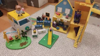 Lote de juguetes de Peppa Pig que incluye varios escenarios y figuras. POSIBILIDAD DE VENDER POR SEPARADO - Casa de Peppa Pig con varios niveles y accesorios. - Ambulancia con figuras de Peppa y el Doctor Brown Bear. - Columpio con figuras. - Mesa de escuela con figuras. - Tobogán y zona de juegos.