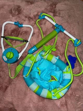 Saltador de puerta y columpio para bebe que se engancha al marco de la puerta. Con juguetes de actividades, corra ajustable, asiento lavable a partir de los 6 meses. En perfectas condiciones.