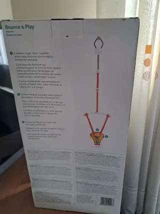 - USADO UNA VEZ - Este saltador de puerta es perfecto para que los más pequeños se diviertan y jueguen de forma segura. Su diseño colorido y los juguetes interactivos lo hacen muy atractivo. - Colgador ajustable para marcos de puerta. - Asiento acolchado y seguro. - Juguetes colgantes para estimular al bebé.