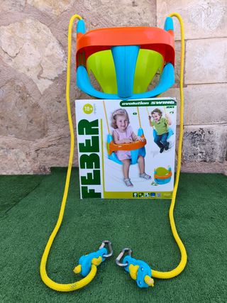 Columpio evolutivo para bebé de la marca FEBER. Está prácticamente nuevo. - Incluye cuerdas y enganches. - Asiento de plástico resistente en tonos verdes, naranjas y azules. - Ideal para niños a partir de 18 meses (según indica la caja).