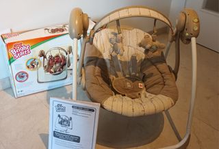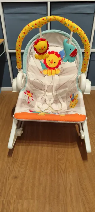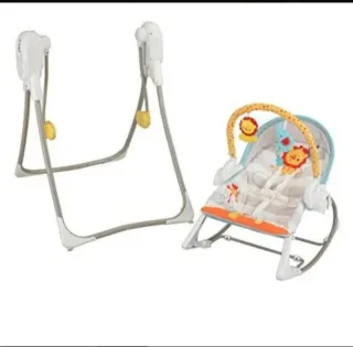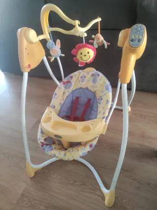 Columpio hamaca de la marca Fisher Price. Puedes usarlo en modo columpio, con 6 velocidades. Tiene música, varias melodías y se puede poner a distinto volumen. También puedes usarla como simple hamaca fija o con balanceo. Va con pilas. El soporte tiene algún arañazo mínimo porque nosotros la hemos usado mucho, sería el típico producto que le aconsejaría a unos padres, pero en general está muy bien. PRECIO NO NEGOCIABLE