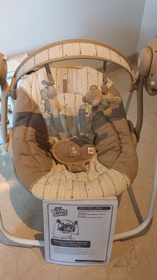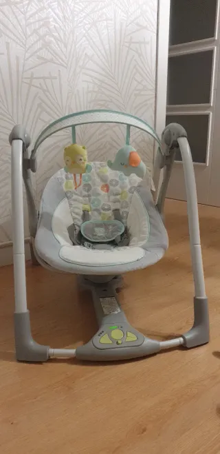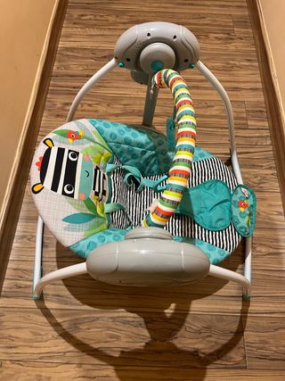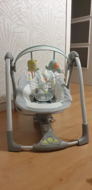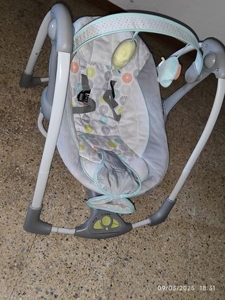 Columpio para bebés de la marca Ingenuity, con un diseño moderno y funcional. - Cinturón de seguridad. - Múltiples velocidades de balanceo. - Música y sonidos relajantes. - Barra de juguetes con peluches. - Plegable para fácil almacenamiento. Nota: no incluye los protectores de hombros del cinturón porque se los quité para mi peque y los perdí. Por lo demás está muy bien cuidado. Solo falta cambiarle las pilas ya que tienen 3 años y estan casi agotadas.