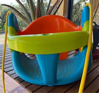 columpio marca Smoby en colores naranja y verde. Ideal 6/36 meses.Medidas 120 cm anchoX120 cm alto x 117 cm profundo.El sillón tiene una anchura de 82cm.Mirar medidas en última foto.