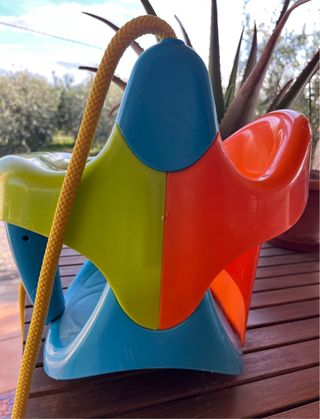 Columpio de la marca Feber para niños. - Diseño colorido con asiento verde, naranja y azul. - Cuerdas resistentes para colgar.