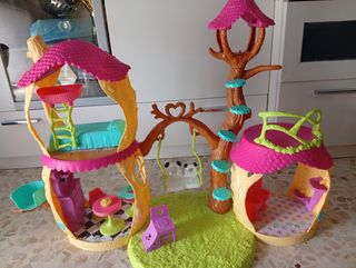 Divertida casa de muñecas Enchantimals con temática de árbol y columpio. - Incluye accesorios como cama, mesa y sillas. - Diseño colorido y detallado. - Ideal para horas de juego imaginativo.