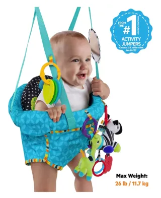 Columpio para bebé de la marca Bright Starts, ideal para colocar en el marco de una puerta. - Diseño colorido con estampado de animales. - Incluye varios juguetes colgantes para entretener al bebé. Una jirafa y una cebra de peluche, mordedores y un espejo - Arnés de seguridad para sujetar al pequeño. Correas para adaptar la altura al bebé a medida que crezca.