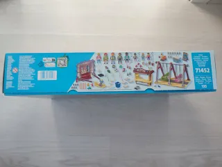 Set de feria Playmobil. - Incluye figuras y accesorios para recrear un ambiente de feria. - Contiene columpios, puestos y elementos decorativos.