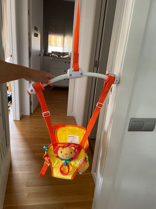 Saltador columpio para bebé, ideal para que los más pequeños se diviertan. - Estructura de plástico resistente. - Asiento de tela con estampado colorido. - Correas ajustables. - se ajusta a la puerta, tal y como se ve en la foto. Peso máximo 11 kg