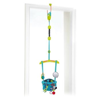 Saltador columpio para bebés, ideal para colocar en el marco de una puerta. Permite que el bebé se divierta y haga ejercicio de forma segura. - Estructura de plástico resistente en color amarillo. - Asiento de tela acolchado en color turquesa con estampado. - Correas ajustables para adaptar la altura. - Sistema de suspensión con muelle y cuentas decorativas.