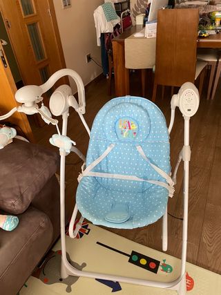 Se vende columpio bebe nuevo,( se usó un par de veces, pero a mi bebe no le gustaba) con movimiento por tiempo como se aprecia en la foto, diferentes melodias, para q el bebé se relaje e incluso se duerma, se puede subir o bajar volumen, no hago envíos, en mi perfil hay más cosas de bebes