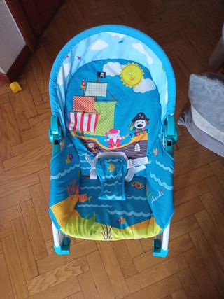 hamaca balancin color azul y con dibujitos de piratas. funciona como sillita, como columpio o como camita si se duerme el bebe ahi mismo . muy poco uso...esta impecable .