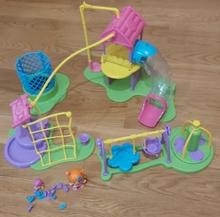 Incluye: cama elástica, tirolina, carrusel, 2 columpios, tobogán curvado transparente, red para escalar, caja de arena. Dos muñecos ( 1 figura de 7 cm;1 bebé de 3,5 cm) y pequeños accesorios. Sin caja.