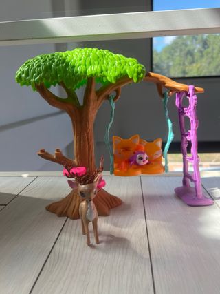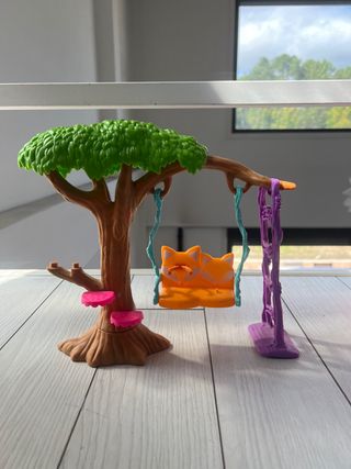 Este encantador parque de juegos de Enchantimals incluye un árbol con plataformas y un columpio. - El columpio tiene un asiento naranja con dos figuras de zorros. - Incluye una estructura morada con forma de árbol para el columpio. - El árbol principal es de color marrón con hojas verdes. - Tiene tres plataformas rosas escalonadas en el tronco.