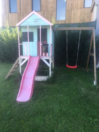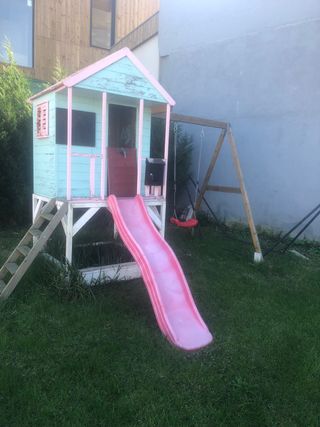 Casita de madera para jugar, ideal para exteriores. Cuenta con un divertido tobogán rosa. - Estructura de madera pintada en tonos pastel. - Ventanas y puerta. - Incorpora un columpio. Necesita un poco de cariño de ahí su precio