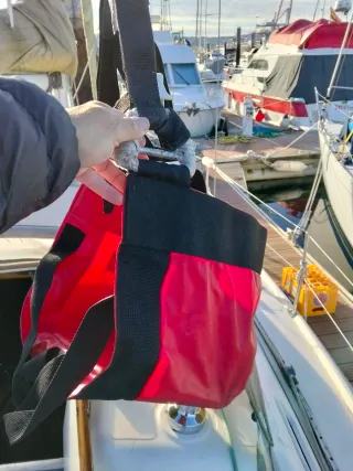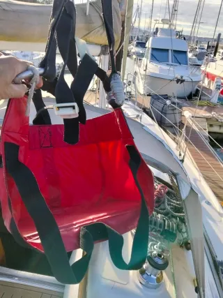 Arnés tipo guindola o columpio para facilitar el acceso al mástil de un velero. Es una herramienta útil para trabajos en altura en embarcaciones. - Color rojo. - Correas negras. - Hebillas de ajuste.