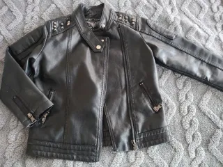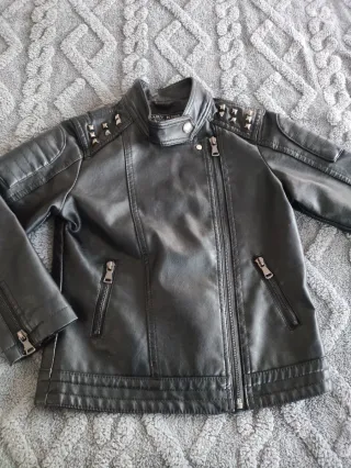 Cazadora estilo motero en color negro. Presenta un diseño moderno con tachuelas decorativas en los hombros y cuello. Talla 5/6. Prácticamente nueva. - Cierre frontal con cremallera. - Bolsillos laterales con cremallera. - Puños con cremallera. - Cuello con solapa y botón a presión.