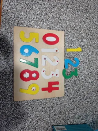 Juego de números de madera para el aprendizaje infantil. Cada número tiene un color vibrante y un diseño atractivo. - Números del 0 al 9. - Material de madera. - Colores variados: amarillo, rojo, azul y verde.