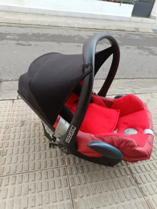 Silla de coche para bebé, también conocida como Maxi-Cosi. Es de color rojo con capota negra. - Capota ajustable. - Arnés de seguridad de 3 puntos. - Asa de transporte. - Base con sistema de anclaje.