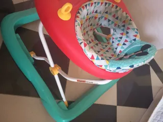 Andador para bebé con un divertido diseño de Mickey Mouse. Perfecto para los primeros pasos. - Asiento acolchado con estampado de triángulos. - Base de plástico resistente en color rojo y verde. - Detalle de Mickey Mouse en el respaldo.