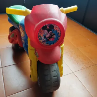 Moto de correpasillos con diseño de Mickey Mouse. Tiene bastante uso, aunque todo dentro de casa. Pegatinas en buen estado. Algún rasguño. - Colores rojo, azul y amarillo. - Ruedas negras. - Asiento azul. - Manillar blanco.
