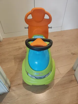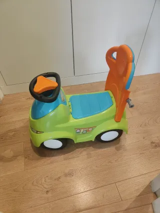 Coche correpasillos PushNGo en vivos colores verde y azul, con asiento y respaldo. - Volante con detalles. - Ruedas blancas y negras. - Respaldo naranja Incluye barra para insertar en la parte trasera y empujar. Ha sido usado en interior.