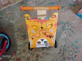 Divertido andador de madera con diseño de gato y múltiples actividades. - Ruedas para facilitar el movimiento. - Cuentas de colores para ensartar. - Laberinto con figuras. - Cierre de seguridad.