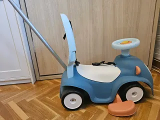 Correpasillos infantil de la marca Smoby con un divertido diseño. - Color azul y detalles en naranja. - Asiento con respaldo. - Volante. - Ruedas. Lo que no tiene es la barra de seguridad para cuando tienes 6 meses. Nunca lo llegamos a usar y no lo encuentro. La plataforma para los pies y la barra para llevarle se quitan.