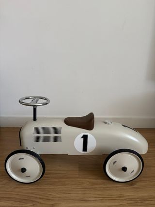 Este coche de correpasillos vintage de la marca Vilac es un juguete clásico y elegante. - Diseño inspirado en coches de carreras antiguos. - Color crema con detalles en negro y marrón. - Número 1 en un círculo blanco en el lateral. - Ruedas de metal con neumáticos de goma. - Volante cromado.