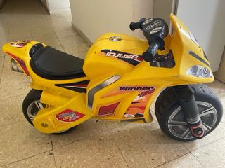 Moto de juguete para niños, de color amarillo brillante y diseño deportivo. - Asiento cómodo y amplio. - Manillar con detalles. - Ruedas estables para mayor seguridad. - En perfecto estado Ideal para el desarrollo del equilibrio