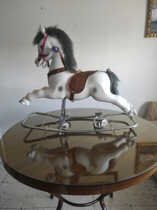 Caballo para niños entre los 6 meses a 2 años y medio, que tiene doble función mediante el mecanismo que posee de funcionar con ruedas para ser un correpasillos o de recoger las ruedas y funcionar como un balancín .