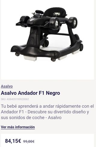 Andador para bebés Asalvo F1 de color negro, en perfecto estado.( En su caja original) - Diseño de coche de Fórmula 1. - Incluye sonidos de coche. - Ayuda al bebé a aprender a caminar. Está prácticamente nuevo en su caja original !!!! mi hijo apenas lo ha usado porque ando enseguida, nos costó casi 100 euros y ahora está en unos 85 euros... Funciona perfectamente, con su ruidos y luces....!!!