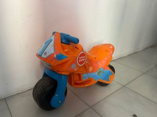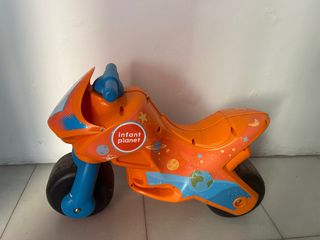 Moto de paseo para niños con un diseño divertido y colorido. - Colores: azul, amarillo, morado y verde. - Asiento morado. - Ruedas negras y verdes. Lo único son las pegatinas que se están despegando, por lo demás está en perfecto estado