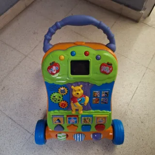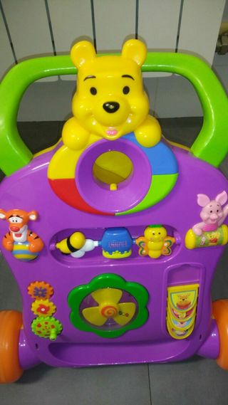 Correpasillos y andador con diseño de Winnie the Pooh y temática de aprendizaje. - Divertidos colores naranja, verde y azul. - Incluye ruedas para facilitar el movimiento. - Panel frontal con elementos interactivos y personajes. - Asa superior para empujar o transportar. -Tecla bloqueo de ruedas. -Funciona con pilas.