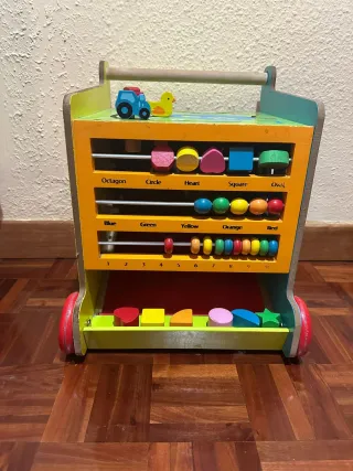 Correpasillos de madera con múltiples actividades para el desarrollo infantil. Ideal para los primeros pasos y el aprendizaje. - Diseño colorido y atractivo. - Incluye engranajes, ábaco, formas geométricas, abecedario... - Ruedas para facilitar el movimiento.
