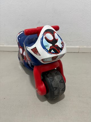 Moto correpasillos Spiderman, usada pero en buen estado. Ideal para que los más pequeños de la casa se diviertan. poco uso pero las pegatinas se rallaron el primer dia - Diseño de Spiderman. - Color azul y rojo. - Ruedas resistentes.