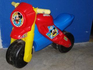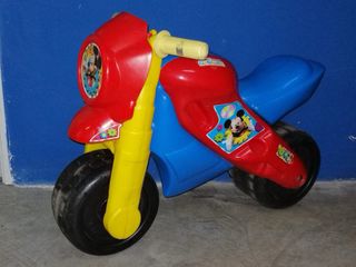 Moto de juguete con diseño de Mickey Mouse. - Colores rojo, amarillo y azul. - Ruedas negras. - Manillar amarillo.