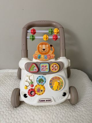 Andador para bebés con múltiples actividades interactivas. Diseñado para el entretenimiento y el desarrollo temprano. - Centro de actividades con figuras de animales y formas. - Ruedas giratorias para facilitar el movimiento. - Panel con engranajes y elementos para manipular. - Diseño colorido con temática de león.